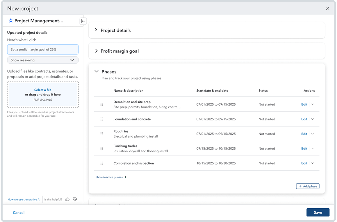 - AI-suggested phases accelerate project setup for PMs managing multiple jobs