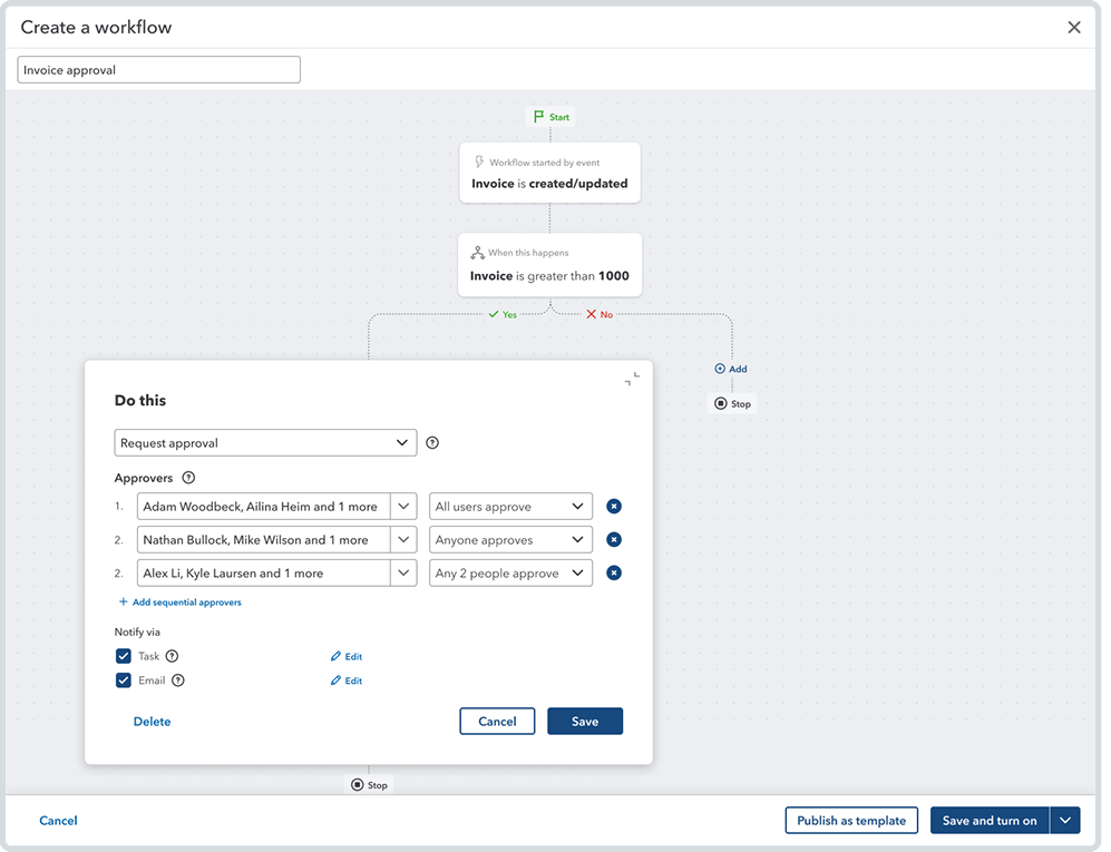 Help make approvals, reminders, and tasks more efficient by setting dimension-based conditions in workflows to more closely match your business structure and financial reporting requirements. For example, Atlanta division POs route to a different approver than Denver, automatically.