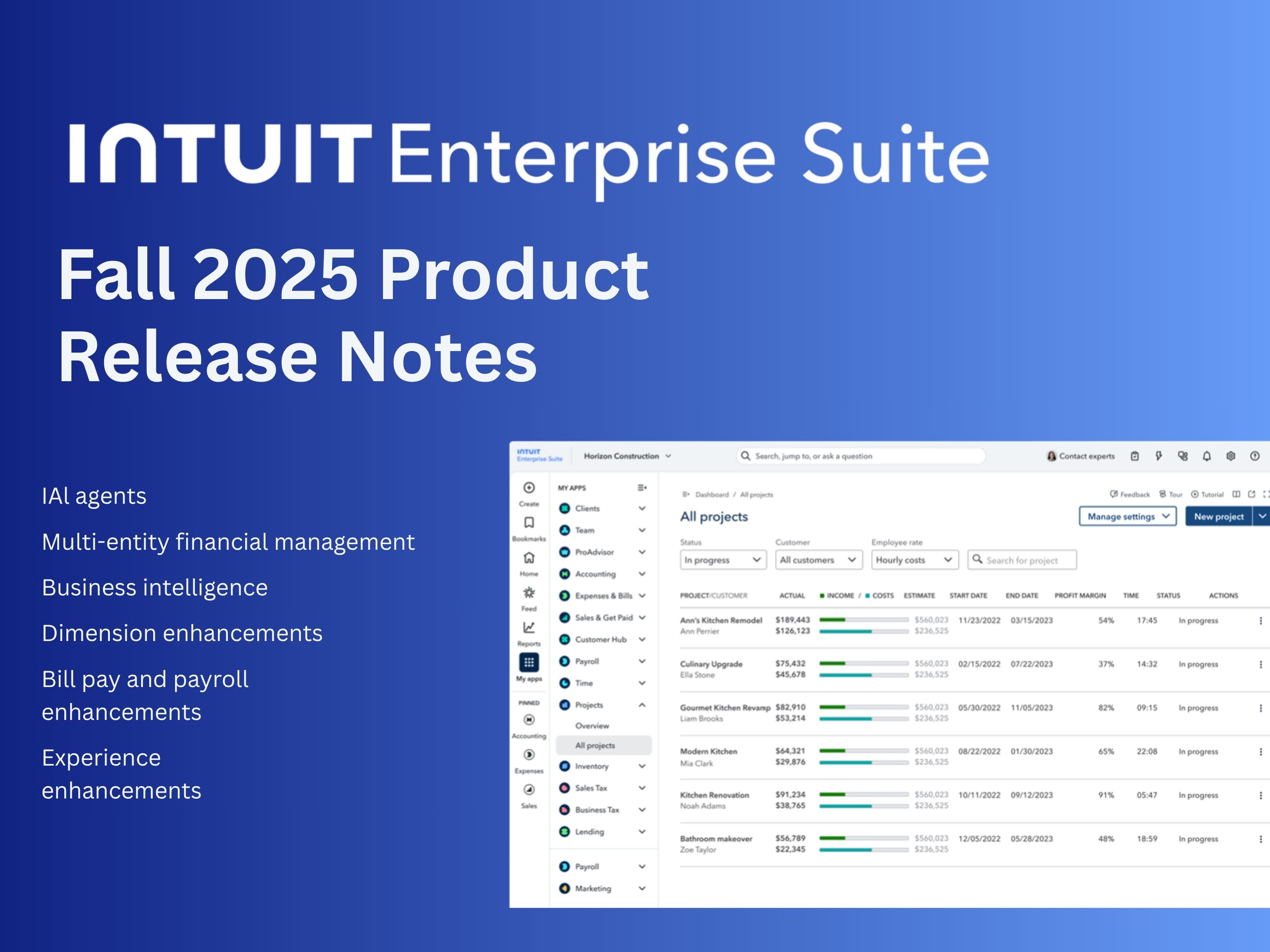 Breakdown of Intuit Enterprise Suite’s Fall 2025 release for contractors, including new AI agents, multi-entity consolidations, business intelligence, and bill pay/payroll updates—plus how RedHammer helps construction firms implement and optimize them.